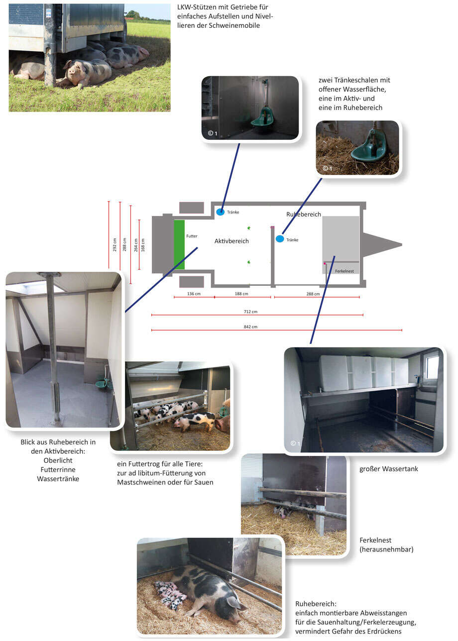 Die mobilen Ställe sind für jede Schweinegruppe geeignet. Mit Abweisstangen und einem Ferkelnest ausgestattet, können die Sauen im Ruhebereich abferkeln und die Ferkel bis zum Absetzen säugen. Nach dem Absetzen können die Mastschweine bis zum Schlachten im stressfreien Familienverbund zusammen in dem mobilen Stall verbleiben.
