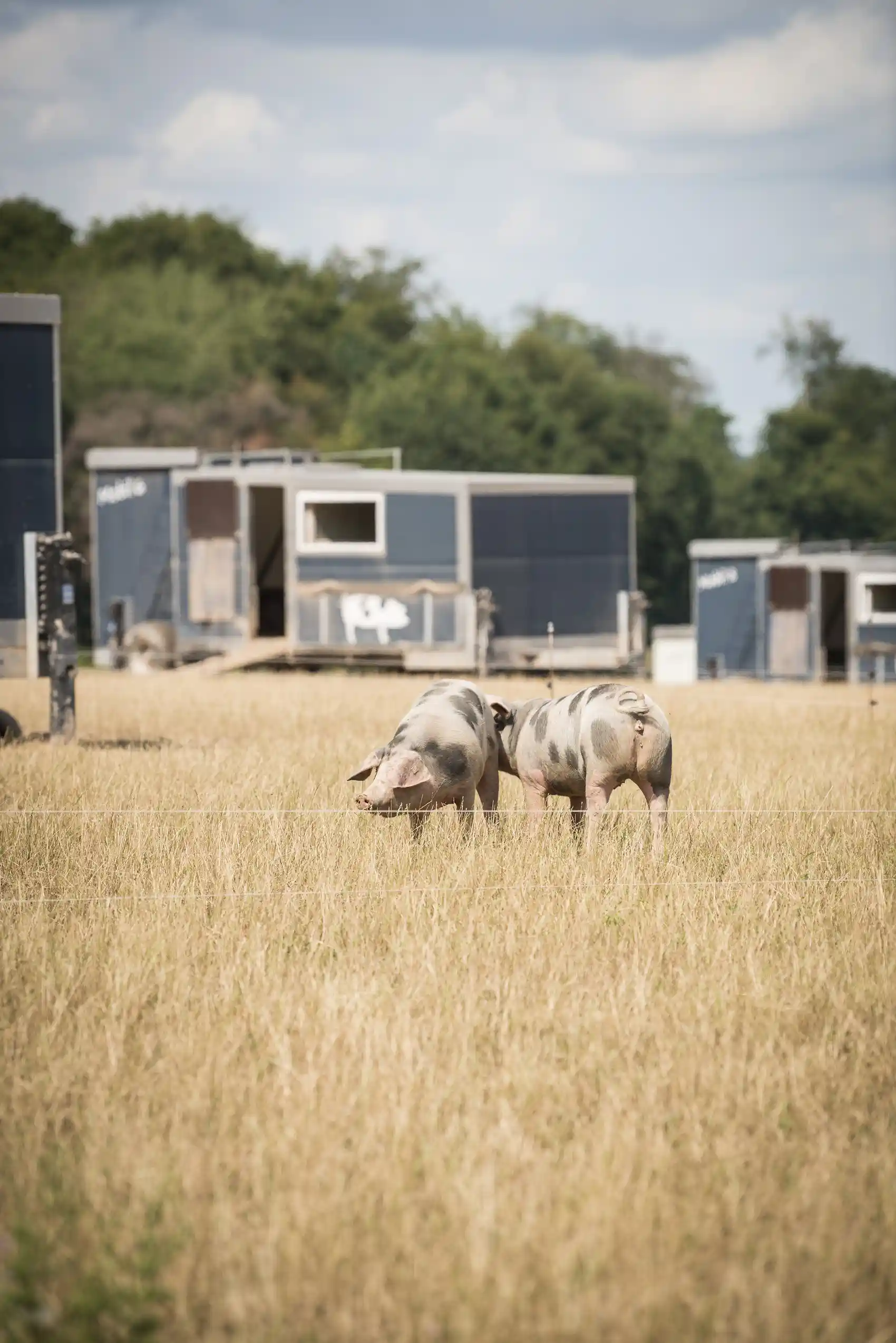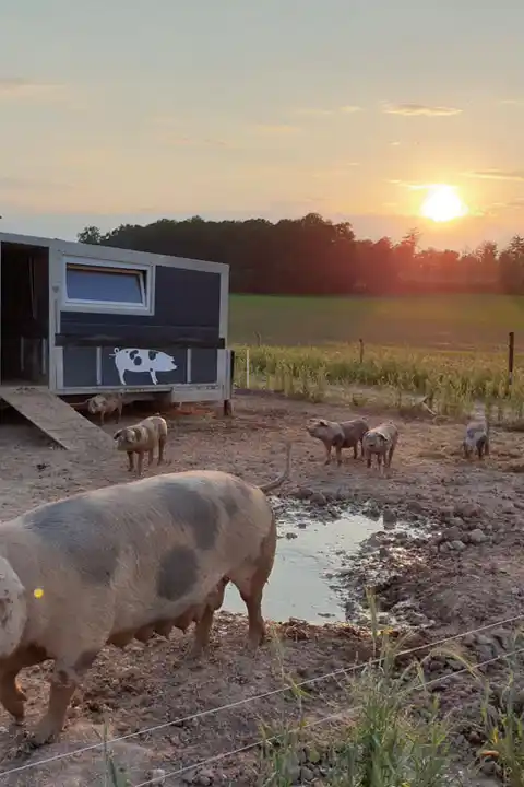 In den mobilen Ställen werfen die Sauen auch ihre Ferkel und säugen sie 8 Wochen lang. Die Muttermilch verleiht den Ferkeln Widerstandsfähigkeit gegen Krankheiten und fördert die Stärkung des natürlichen Immunsystems. Nach dem Absetzen bleiben die Jungschweine bis zum Schlachten im stressfreien Familienbund zusammen in dem mobilen Stall.