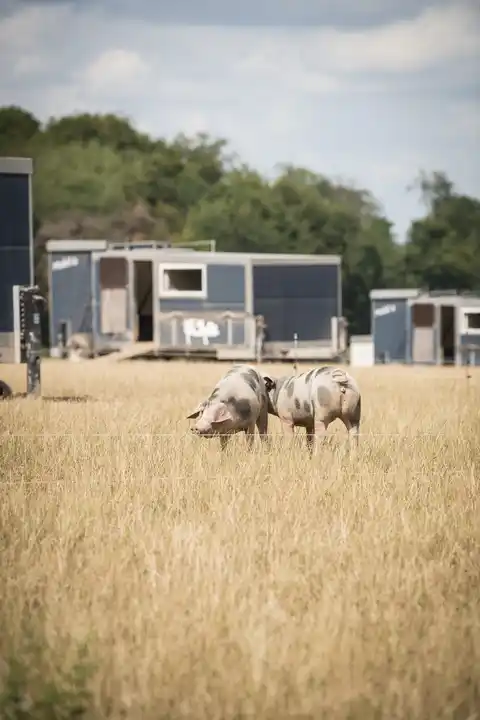 Die mobile Auslaufhaltung verbindet die Vorteile der Freiland- und Stallhaltung miteinander. Die Stallhaltung bietet den Tieren einen warmen Ort, an den sie sich zurückziehen können. So sind sie vor äußeren Einflüssen wie Wind, Regen und zu viel Sonne geschützt. Im mobilen Schweinestall können die Schweine sich jederzeit mit Wasser und Futter versorgen. Den Rückzugsort bietet der mobile Stall direkt auf dem Acker. Die Tiere haben die Wahl, ob sie sich draußen auf der Auslauffläche aufhalten, sich suhlen oder graben möchten, oder ob sie sich lieber im Liegebereich zu einem Nickerchen zurückziehen wollen.